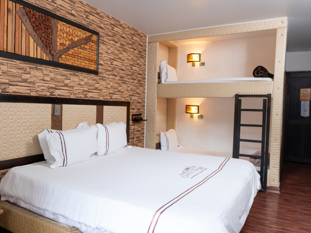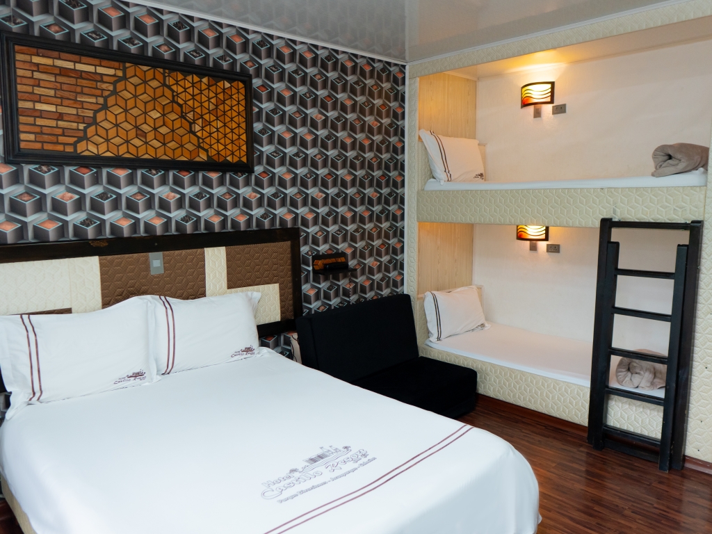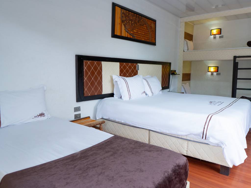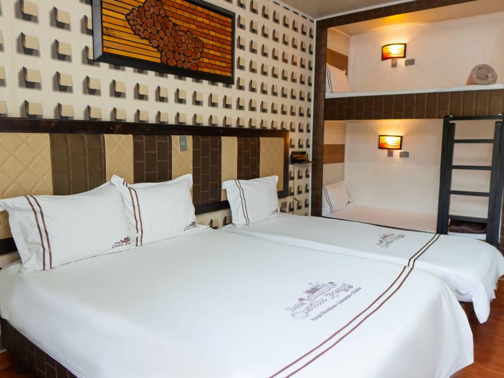 Habitaciones y suites Home Habitaciones y suites Doble Matrimonial Doble King Size Doble Matrimonial 8vo Piso Doble Semisuite Triple Matrimonial Triple king Size Cuádruple Matrimonial Séxtuple camarote Servicios Deportes de Aventura Eventos Sociales SPA Contáctenos X Doble Matrimonial Habitación confortable con cama matrimonial con capacidad para 2 personas con minibar, balcón, aire acondicionado. Doble King size Habitación con cama King Size con capacidad para 2 personas con minibar, balcón, aire acondicionado Doble Matrimonial 8vo piso Habitación confortable con cama matrimonial con capacidad para 2 personas con aire acondicionado, tv, baño privado. Doble Semisuite Habitación confortable con cama king con capacidad para 2 personas con Jacuzzi, sala de estar, minibar, balcón, aire acondicionado balcón. Triple Matrimonial Habitación confortable con cama matrimonial y camarote con capacidad para 3 personas. Triple King Size Habitación con cama King Size y camarote con capacidad para 3 personas con minibar, balcón, aire acondicionado Triple Matrimonial 8vo piso Habitación confortable con cama matrimonial y camarote con capacidad para 3 personas Cuádruple Matrimonial Habitación confortable con cama matrimonial y camarote con capacidad para 4 personas Cuádruple Triple King Size Habitación con cama King Size y camarote con capacidad para 4 personas con minibar, balcón, aire acondicionado Cuádruple Matrimonial 8vo piso Habitación con cama matrimonial y camarote con capacidad para 4 personas Quíntuple Matrimonial Habitación confortable con cama matrimonial con capacidad para 5 personas Quíntuple King Size Habitación con cama King Size con capacidad para 5 personas con minibar, balcón, aire acondicionado Sextuple Camarote Habitación confortable capacidad para 6 personas en camarotes
